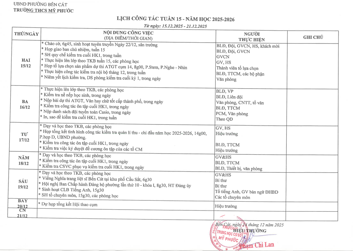 Lịch công tác tuần 15 (15/12/2025 - 21/12/2025)