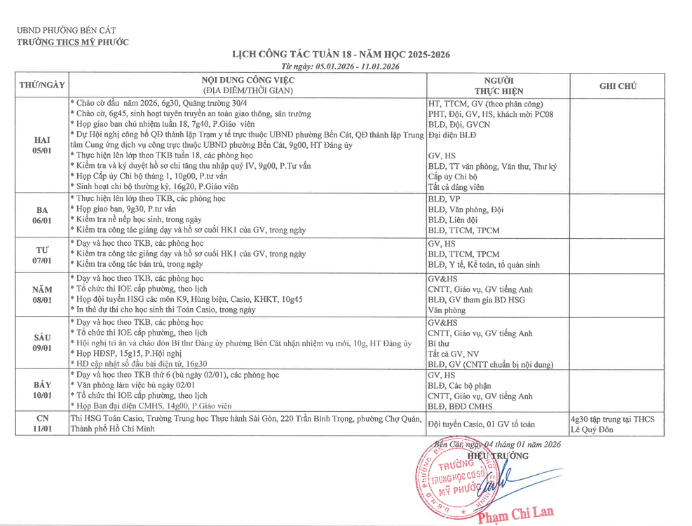 Lịch công tác tuần 18 (05/01/2026 - 11/01/2026)