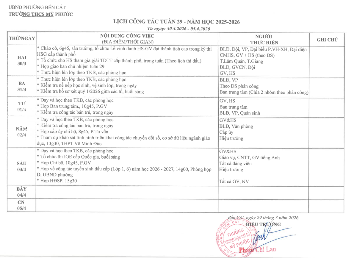 Lịch công tác tuần 29(30/03/2026 - 05/04/2026)