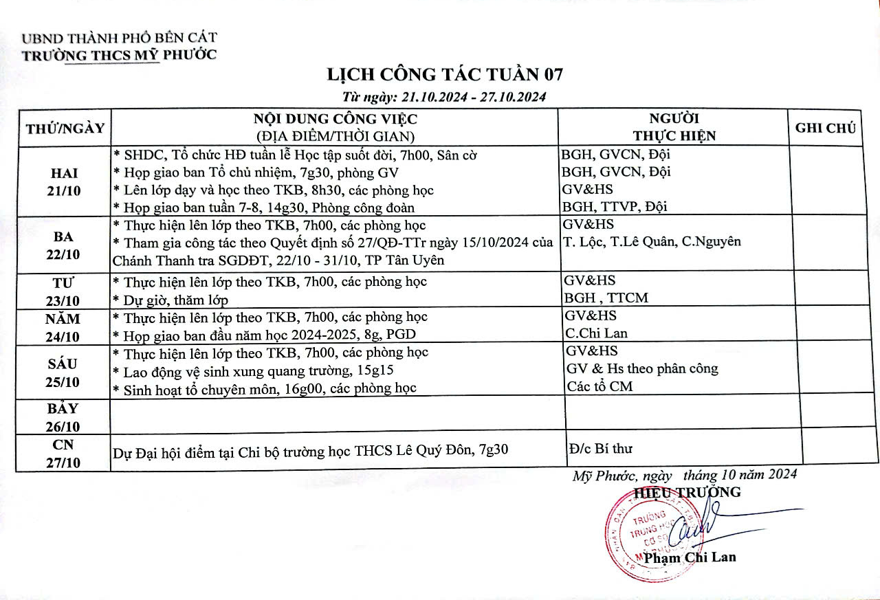 LỊCH CÔNG TÁC TUẦN 7