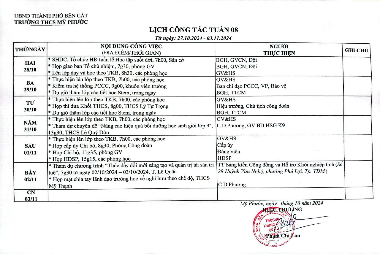 LỊCH CÔNG TÁC TUẦN 8