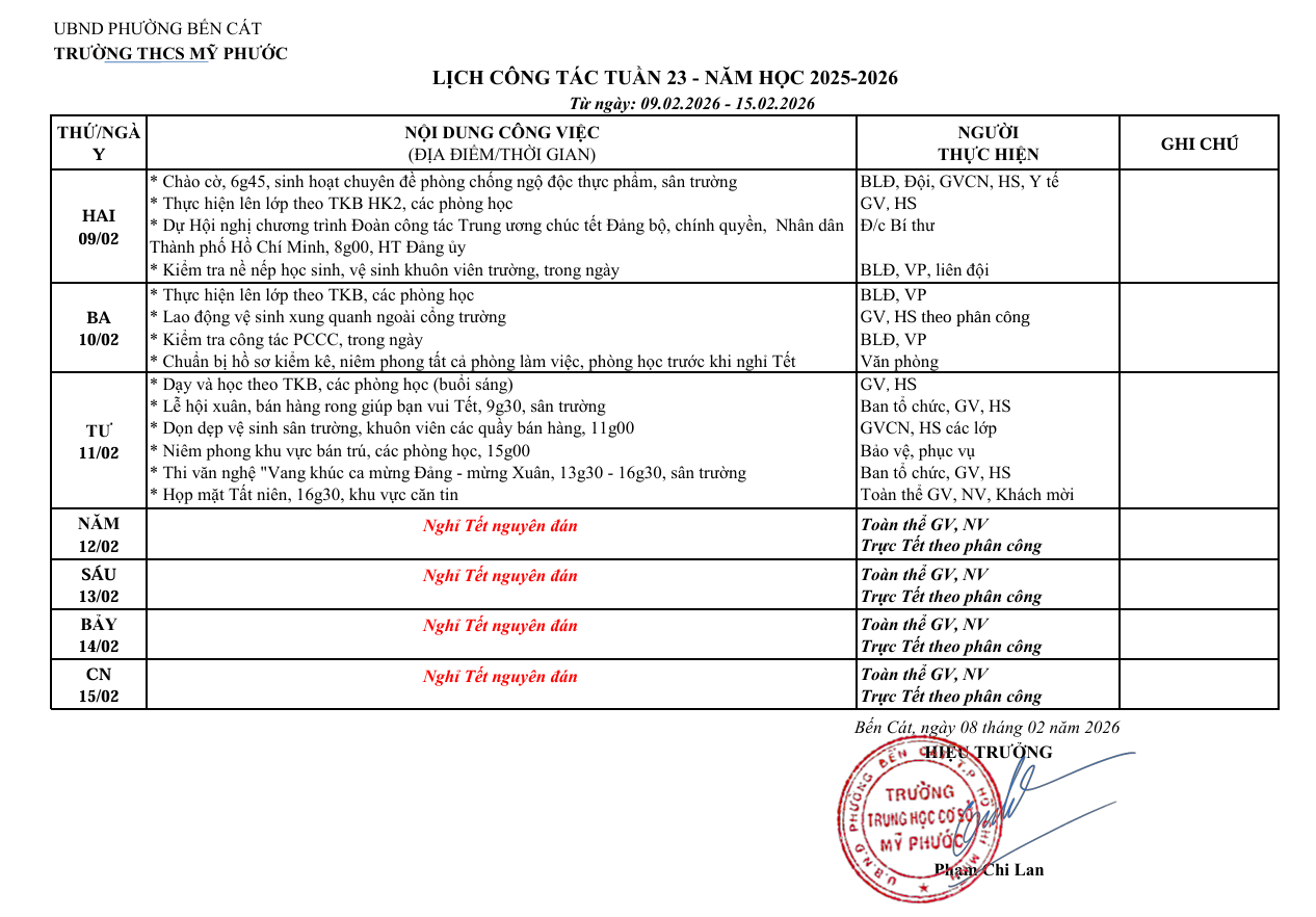 Lịch công tác tuần 23(09/02/2026 - 15/02/2026)