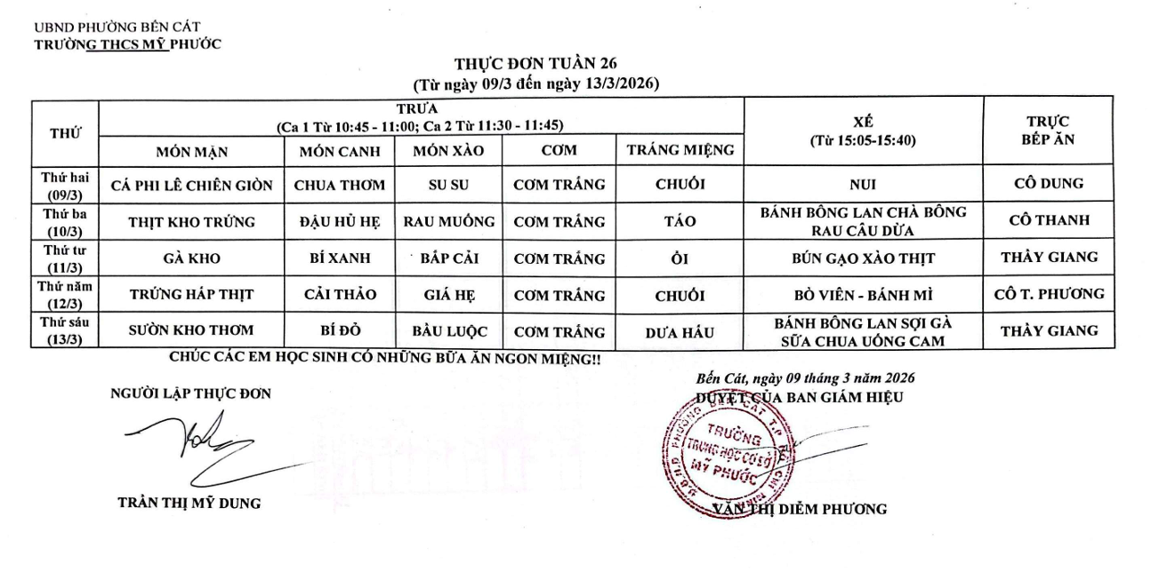 Thực đơn tuần 26, năm học 2025-2026